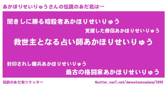 | 男性向けラノベタイトル風あだ名 | 『あかほりせいりゅう~年齢イコール彼女いない歴の魔法使い~』 |