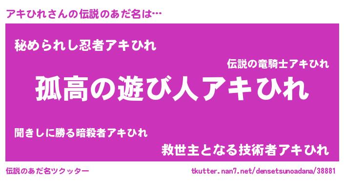 | ヒーロー風カッコイイあだ名 | 『仮面アキダー』『サイバー戦士アキヒレ』 |