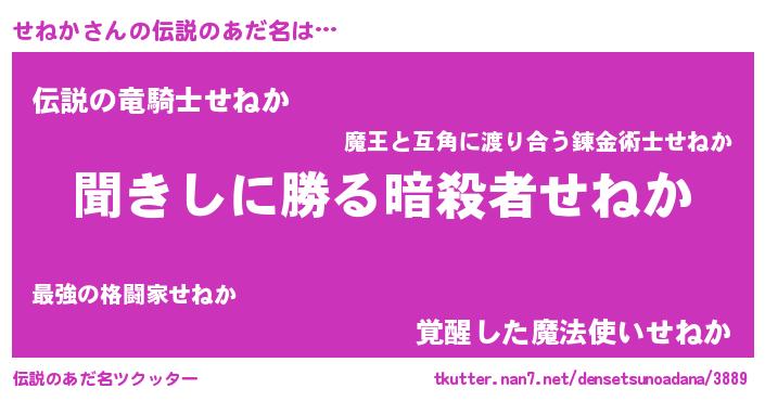 | 男性向けラノベタイトル風あだ名 | 『魔弾の王とせねか』 |