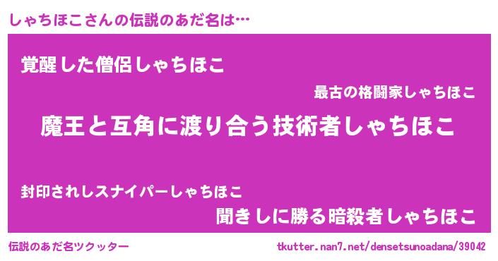 | 男性向けラノベタイトル風あだ名 | 『おまえをオタクにしてやるから、俺をしゃちほこにしてくれ! 』 |