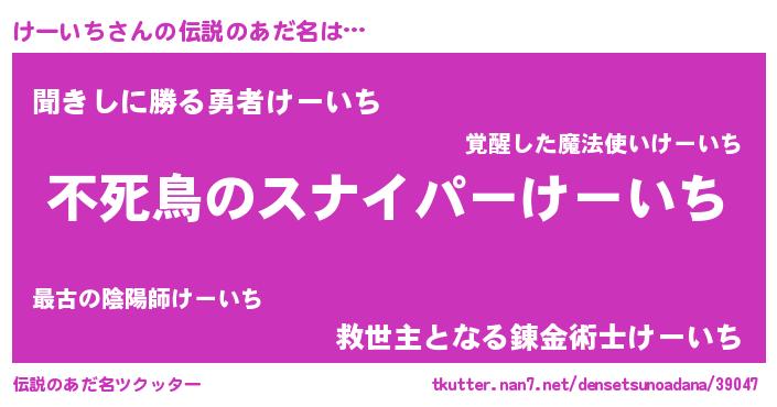 | 意味不明あだ名 | 『ペロリンけーいち』『自称けーいち』 |