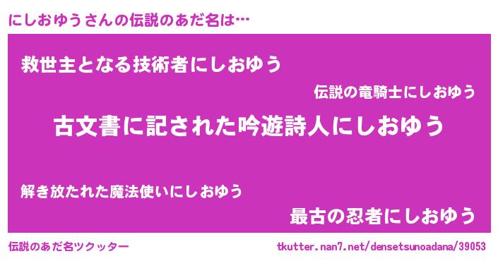 | 男性向けラノベタイトル風あだ名 | 『にしおゆうに滅ぼされるだけの簡単なお仕事です』 |