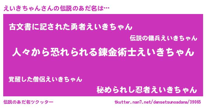 | 男性向けラノベタイトル風あだ名 | 『おまえをオタクにしてやるから、俺をえいきちゃんにしてくれ! 』 |