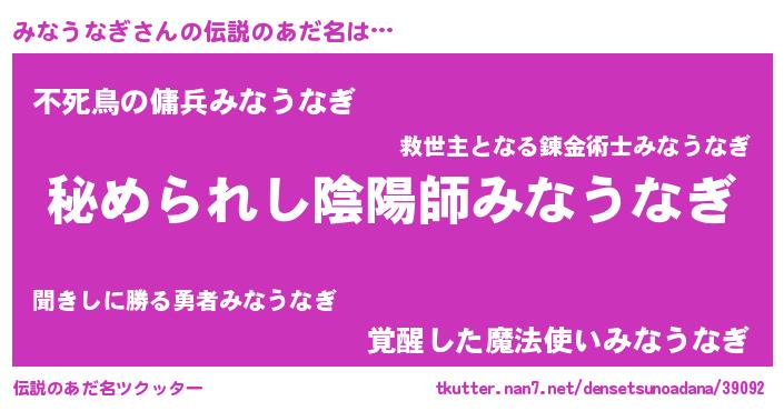 | 男性向けラノベタイトル風あだ名 | 『ミナウナギスレイヤー』 |