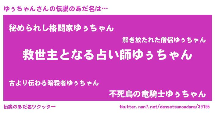 | ヒーロー風カッコイイあだ名 | 『慈愛の使者ゆぅちゃん』『黄金騎士ユゥ』 |