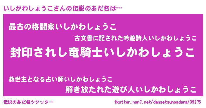 | 男性向けラノベタイトル風あだ名 | 『いしかわしょうこ~年齢イコール彼女いない歴の魔法使い~』 |