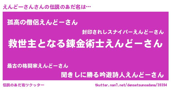 | ヒーロー風カッコイイあだ名 | 『究極戦士エンドーサン』『黄金騎士エン』 |