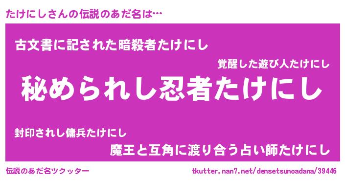 | ヒーロー風カッコイイあだ名 | 『ウルトラたけにしマン』『ネオタケニシ』 |