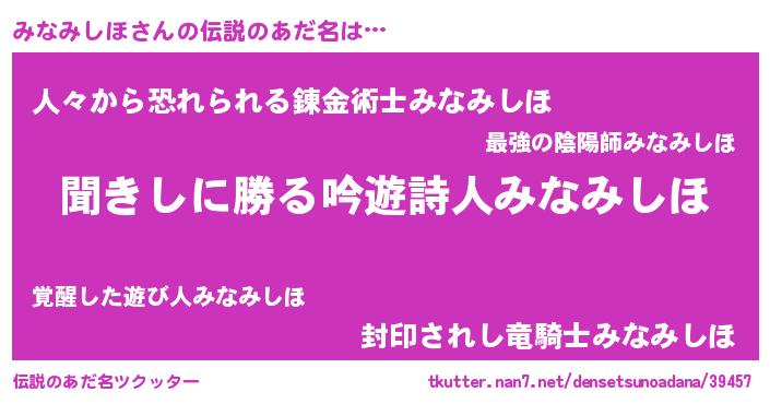 | 男性向けラノベタイトル風あだ名 | 『ミナミシホスレイヤー』 |