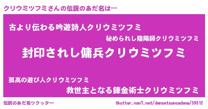| 意味不明あだ名 | 『自称クリウミツフミ』 |