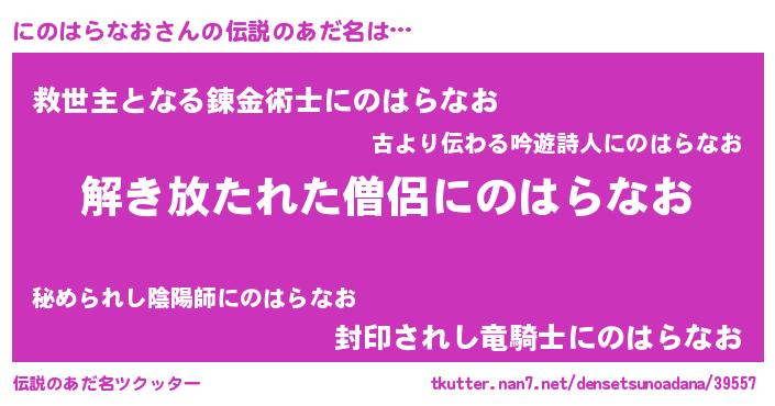 | 男性向けラノベタイトル風あだ名 | 『転生したらにのはらなおだった件』 |
