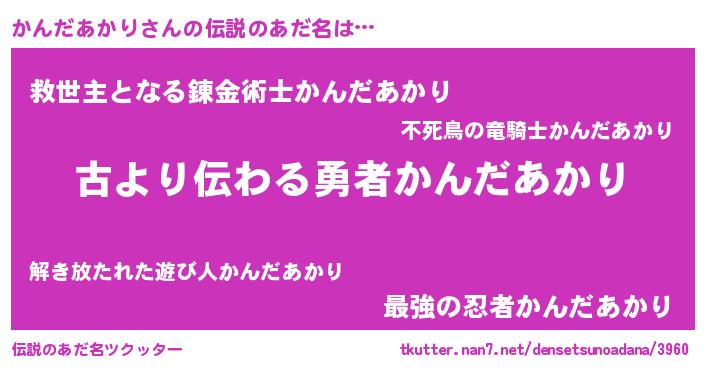 | 胡散臭い通販商品みたいなあだ名 | 『来世でも幸せになれる水素水…その名も「かんだあかり」』 |