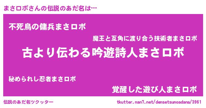 | 女子向けラノベタイトル風あだ名 | 『まさロボの契約王妃』『闇のまさロボ』 |