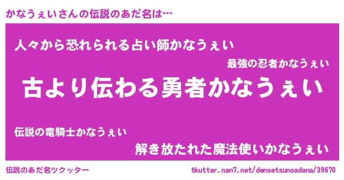 | ヒーロー風カッコイイあだ名 | 『ネオカナウェイ』『魔戒騎士カナ』 |