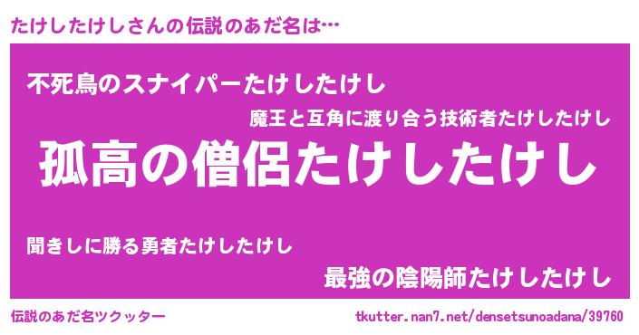 | 男性向けラノベタイトル風あだ名 | 『ダンジョンにたけしたけしを求めるのは間違っているだろうか』 |