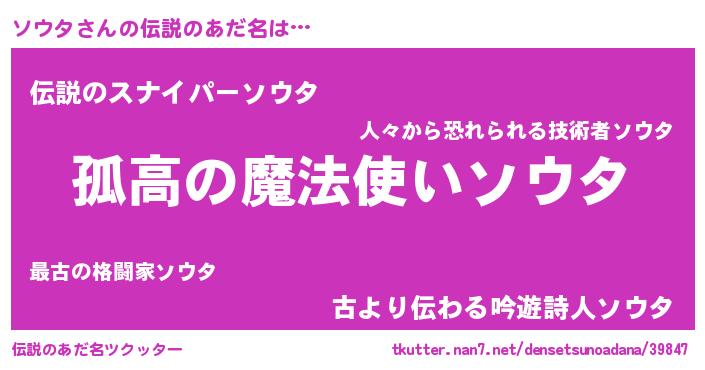 | ヒーロー風カッコイイあだ名 | 『ウルトラ戦士ソウタ』『黄金騎士ソウ』 |