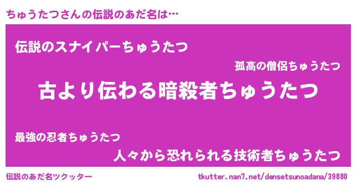 | 男性向けラノベタイトル風あだ名 | 『転生したらちゅうたつだった件』 |