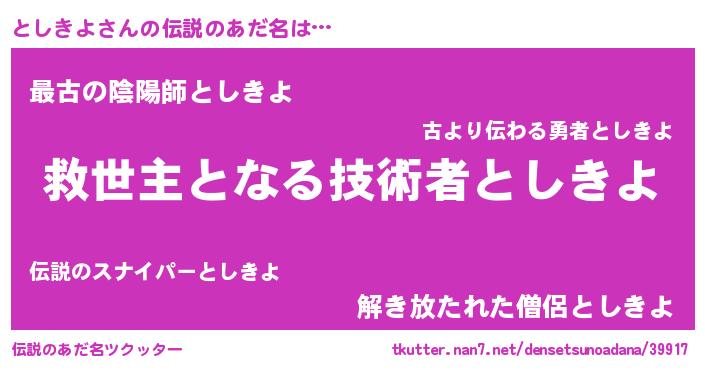 | ヒーロー風カッコイイあだ名 | 『天空の使者としきよ』『魔戒騎士トシ』 |