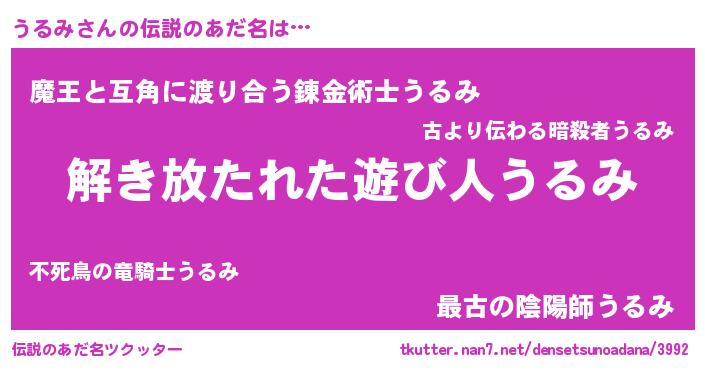 | 意味不明あだ名 | 『とにかく怪しいうるみ』『自称うるみ』 |