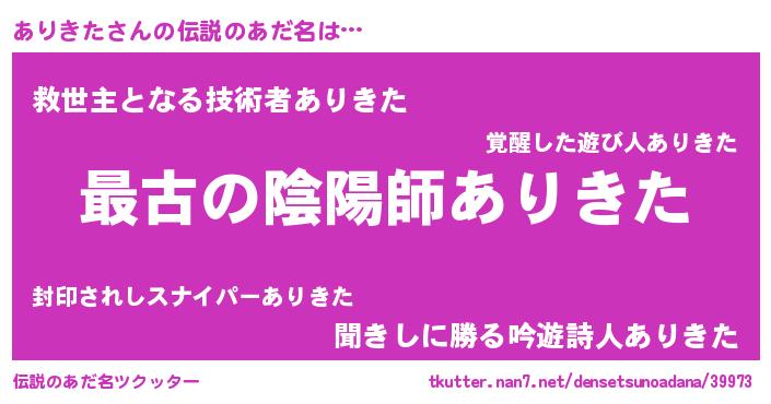 | 意味不明あだ名 | 『ありきたフォーエバー』『自称ありきた』 |