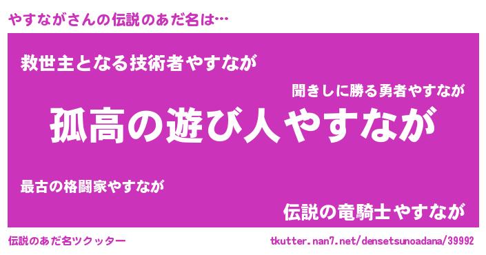 | ヒーロー風カッコイイあだ名 | 『魔戒騎士ヤス』『慈愛の使者やすなが』 |