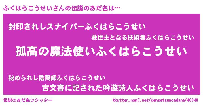 | 胡散臭い通販商品みたいなあだ名 | 『信頼と実績のサプリメント…その名も「ふくはらこうせい」』 |