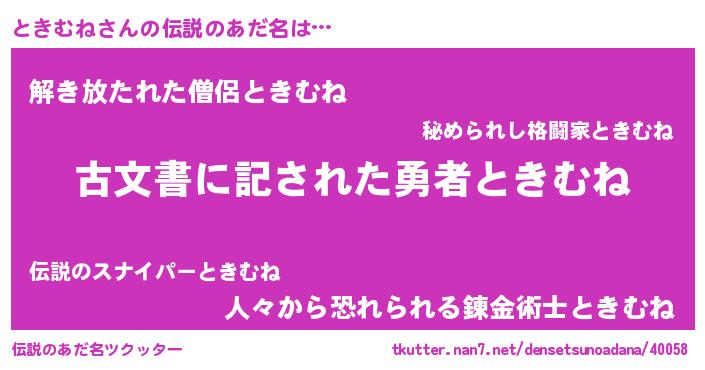 | 意味不明あだ名 | 『住所不定無職ときむね(95歳)』 |