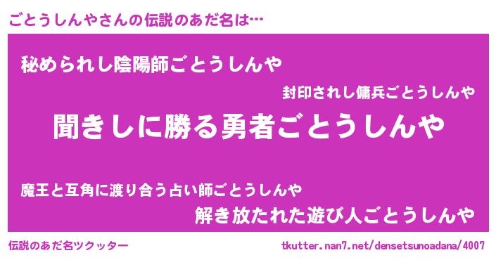 | 胡散臭い通販商品みたいなあだ名 | 『絶対に幸福をもたらす水素水…その名も「ごとうしんや」』 |