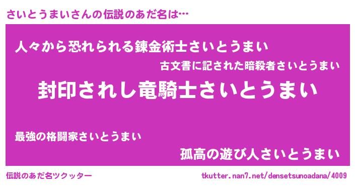 | 胡散臭い通販商品みたいなあだ名 | 『億万長者になれるブレスレット…その名も「さいとうまい」』 |