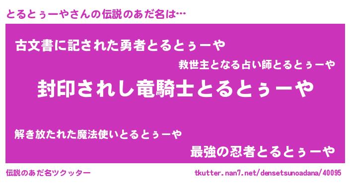 | 男性向けラノベタイトル風あだ名 | 『とるとぅーやに滅ぼされるだけの簡単なお仕事です』 |