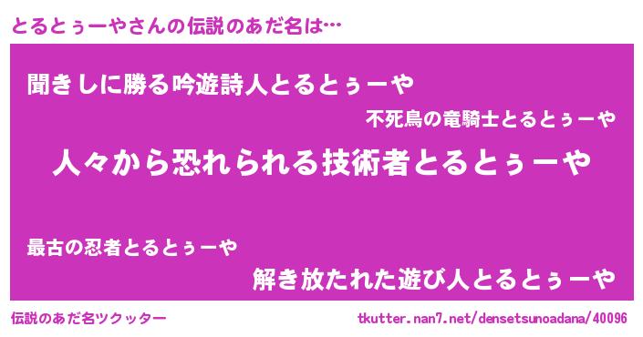 | 意味不明あだ名 | 『住所不定無職とるとぅーや(7歳)』 |