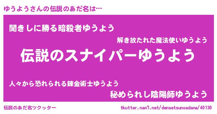 | ファンタジー風あだ名 | 『ユウフェル』『ゼユウトゥ』 |