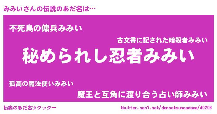 | 意味不明あだ名 | 『みみいフォーエバー』『自称みみい』 |