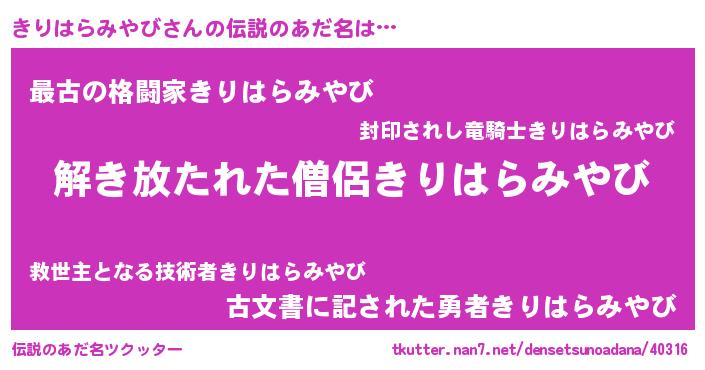 | ヒーロー風カッコイイあだ名 | 『サイバー戦士キリハラミヤビ』 |