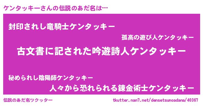 | 男性向けラノベタイトル風あだ名 | 『誰もが恐れるあのケンタッキーが、ぼくの専属メイドになるようです。』 |