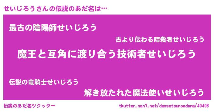 | 男性向けラノベタイトル風あだ名 | 『おまえをオタクにしてやるから、俺をせいじろうにしてくれ! 』 |
