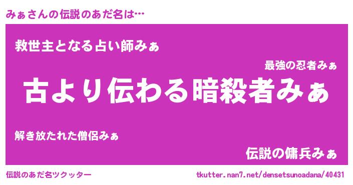 | 胡散臭い通販商品みたいなあだ名 | 『来世でも幸せになれる健康食品…その名も「みぁ」』 |