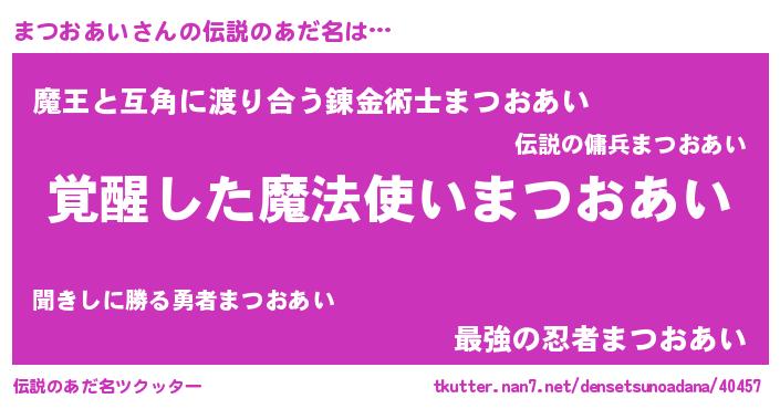 | 男性向けラノベタイトル風あだ名 | 『まつおあい~年齢イコール彼女いない歴の魔法使い~』 |