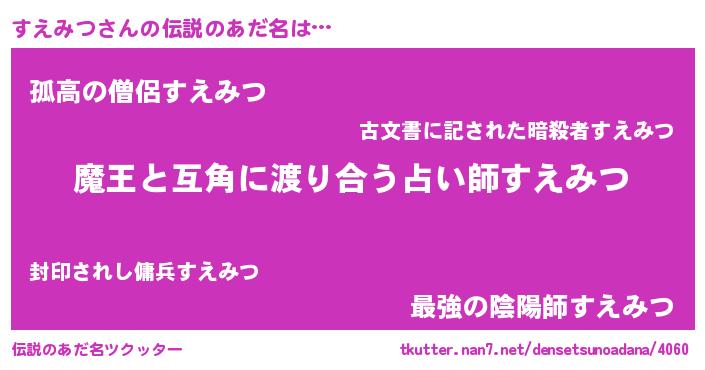 | ヒーロー風カッコイイあだ名 | 『サイバー戦士スエミツ』『幻影騎士スエ』 |