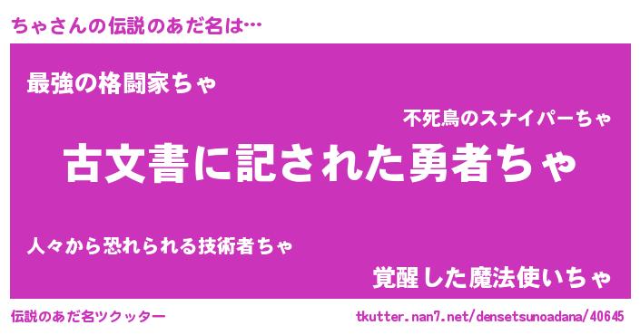 | 男性向けラノベタイトル風あだ名 | 『ちゃ~年齢イコール彼女いない歴の魔法使い~』 |