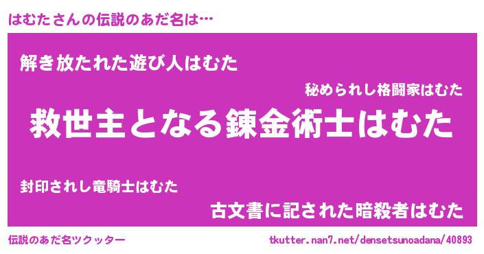 | ヒーロー風カッコイイあだ名 | 『慈愛の使者はむた』『銀牙騎士ハム』 |