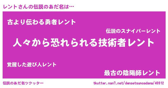 | ヒーロー風カッコイイあだ名 | 『正義の使者レント』『ネオレント』 |