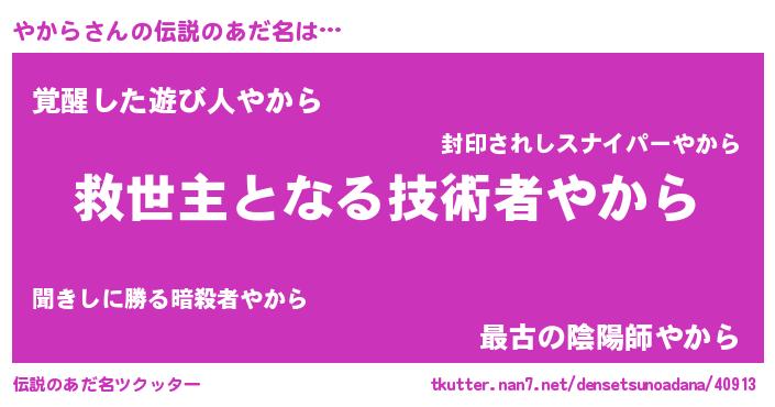 | 男性向けラノベタイトル風あだ名 | 『ノーゲーム・ノーヤカラ』 |