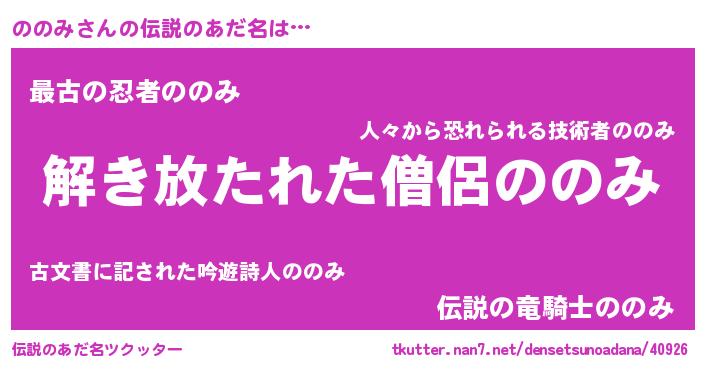 | ヒーロー風カッコイイあだ名 | 『サイバー戦士ノノミ』『銀牙騎士ノノ』 |