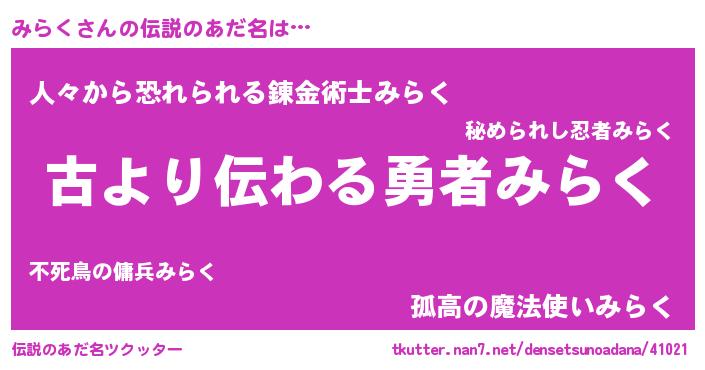 | ヒーロー風カッコイイあだ名 | 『ネオミラク』『ウルトラ戦士ミラク』 |