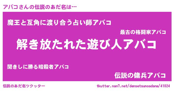 | 意味不明あだ名 | 『自称アバコ』『とにかく怪しいアバコ』 |