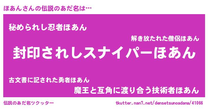 | 胡散臭い通販商品みたいなあだ名 | 『あなたにだけ特別に提供する世界で10本だけ現存している希少なブランデー…その名も「ほあん」』 |