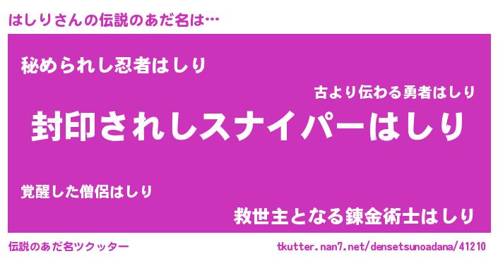 | ヒーロー風カッコイイあだ名 | 『スーパーハシリ』『超時空戦士ハシリ』 |