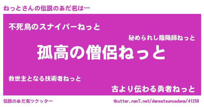 | ヒーロー風カッコイイあだ名 | 『黄金騎士ネッ』『最強戦士ネット』 |
