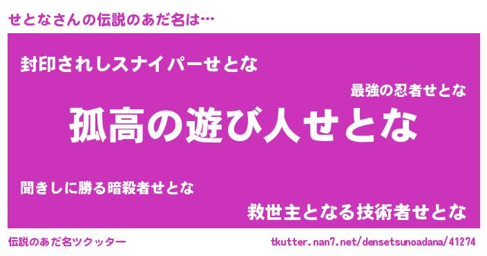 | 意味不明あだ名 | 『めかぶ科せとな属』『自称せとな』 |